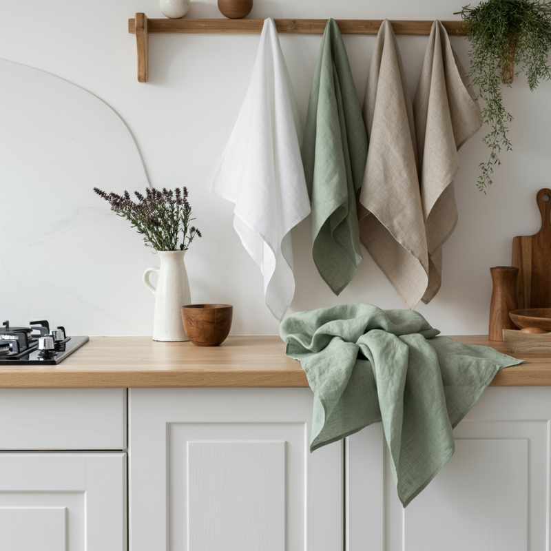 For those who value a natural, elegant look and quick-drying versatility, linen towels are an inspired choice. For softness, durability, and effortless everyday care, cotton towels shine. Blending both allows you to enjoy the refined beauty of linen and the cozy reliability of cotton — each complementing different moments in your kitchen.