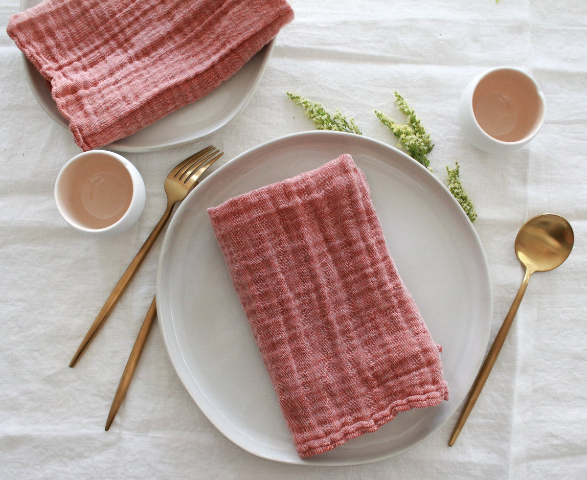 Stunning dusty pink cotton napkins, handcrafted from a bespoke fabric featuring a blend of two harmonies pink tones on both sides, resulting in a subtle yet refined aesthetic. Made from 100% premium Turkish cotton, these napkins guarantee unmatched softness, durability, and lasting quality. Expertly pre-washed for instant usability, they present an irresistibly plush texture, elevating any table arrangement effortlessly.